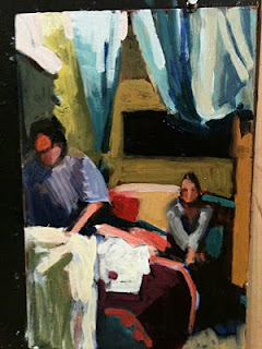 This is the Iraqi mama. I met her at Goodwill when we bumped into each other. She has been here one year. She came with her daughter. The rest of the nuclear family was dispersed to many different nations. It was so weird to meet her and her daughter the very same day that I had read about her country being so uninhabitable in the New York Times. They are glad to be in a safe place even though far from loved ones. As I painted her, I realized that she reminded me of one of my best friends...also a mother of many. Both of these women are modest, content with basics, oh and clutch their purse the same way. You know the way your mom or grandma clutched her pocketbook!? See, we are ALL more alike than different!